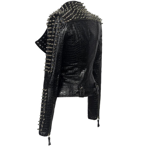 Women PU Leather Studded Spike Full Sleeve Crocodile Skin Jacket